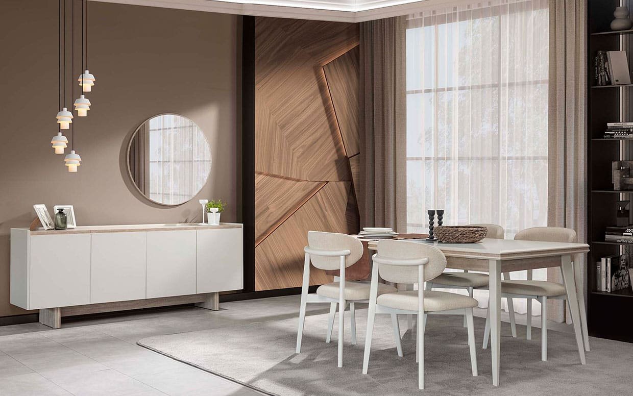 Takım İçeriği Yemek odası takım içeriği 1 adet konsol, 1 adet yemek masası ve 4 adet sandalye fiyatlandırmasıdır.