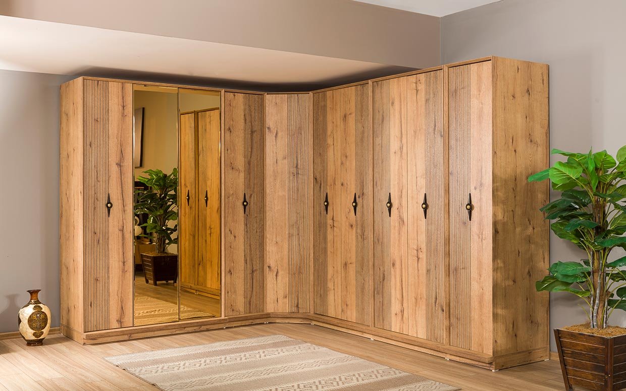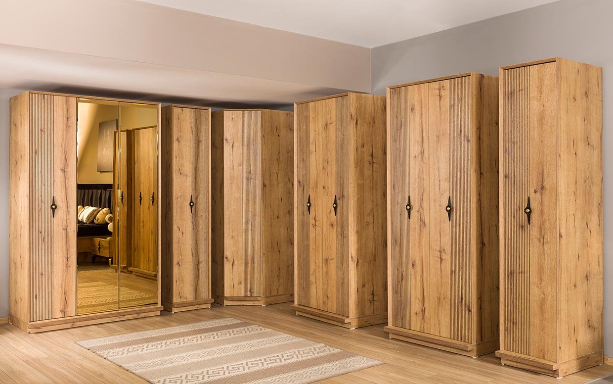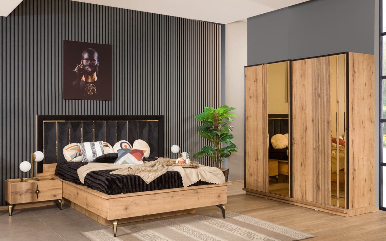 Takım İçeriği Yatak Odası takım içeriğinde 1 adet 4 kapaklı  dolap, 1 adet başlıklı karyola, 2 adet komodin bulunmaktadır.